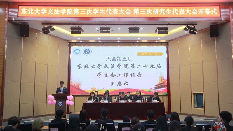 第二十九届学生会向大会作了《百年学府风华正茂贯彻精神助力振兴——以习近平总书记回信精神为指引,做堪当民族复兴重任的时代新人》的工作报告。报告全面总结了一年来院学生会在思想引领、组织建设、校园文化、社会实践与志愿服务、创新创业、服务师生等方面取得的成绩,并号召全体学生骨干团结带领广大同学在建设一流大学中书写文法学子的青春篇章。