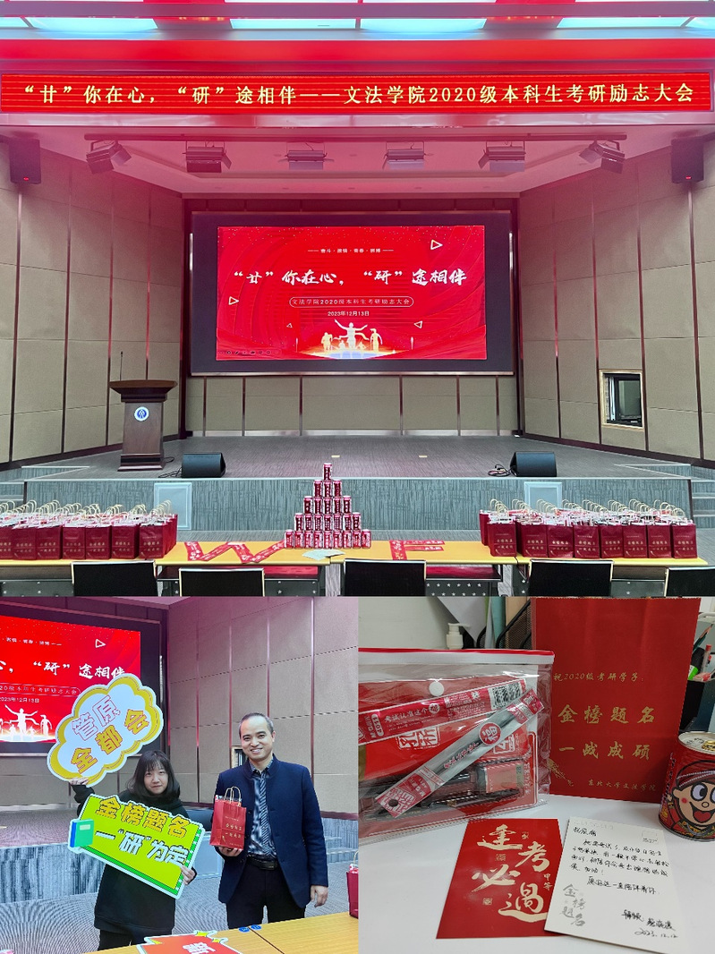 举办“‘廿’你在心,‘研’途相伴”2020级本科生考研励志大会,学院党委副书记兼副院长夏风云、学院团委书记兼20级本科生辅导员蔡晓淇及全体考研学生参会。