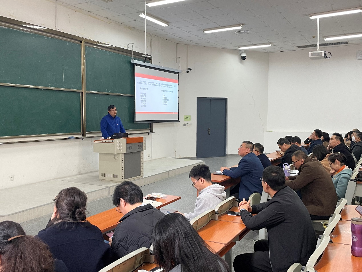 学院党委副书记、纪委书记孙宏伟讲述了高校违法违纪典型案例,结合相关案例就教职工行为规范进行了师德师风教育。