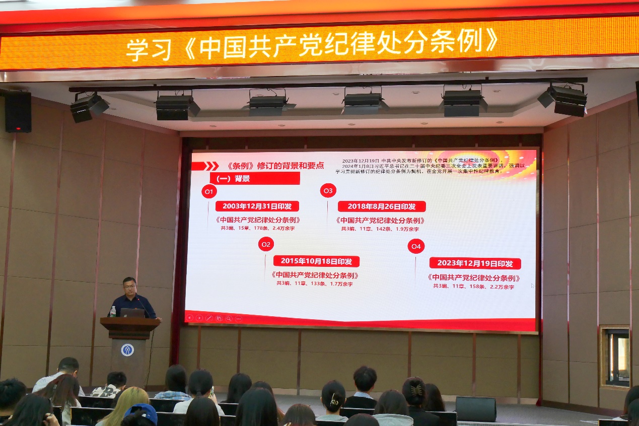 孙宏伟从《条例》作为规范党组织和党员行为的基础性法规,是全党在政治上同党中央保持高度一致的重要保证,为以中国式现代化全面推进强国建设、民族复兴伟业提供坚强纪律保障的重要意义出发,围绕《条例》修订的背景和要点、主要违纪行为及处分、《条例》的贯彻执行等三个方面进行了讲解。要求党员同学要学深悟透习近平总书记关于党的自我革命的重要思想,深刻领悟“两个确立”的决定性意义、坚决做到“两个维护”,不断持续深入学习《条例》,自觉将纪律要求内化于心、外化于行,不断坚定理想信念、加强党性锻炼、升华精神境界,提升道德水平。